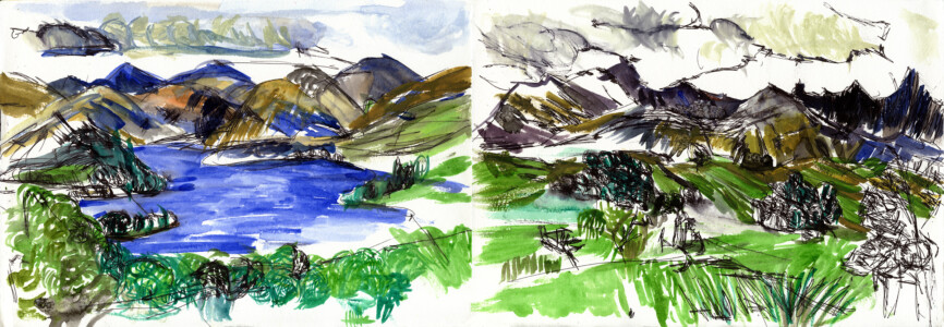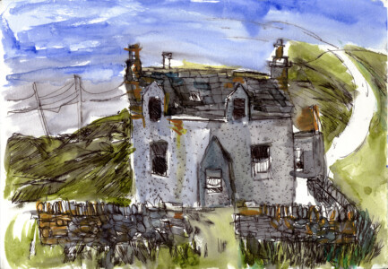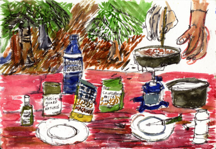 Anne Peeters grave ses lieux de vie d’une écriture volontaire. Elle nourrissait jadis des carnets de voyages et promenades à l’aquarelle. Puis ce furent des pointes-sèches sur cello, (support léger), exécutées après avoir gravi une montagne à vélo ou biné dans son potager. Rapides saisies de sensations : en plein air les poussées de végétations frénétiques ou d’architectures erratiques; dans la cuisine, la chambre, l’atelier, au bistrot celles amoncellements d’objets singuliers. Le lino sert encore une propagande efficace : affiches de spectacles du Théâtre du N-Ombr’Ile, programmes de Coiffure Liliane – une table d’hôte avec attractions qui devint un cabaret, où elle a beaucoup donné. Anne Peeters est d’une grande vitalité, elle a le cœur sur la main, elle partage dans l’enthousiasme.