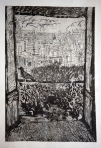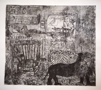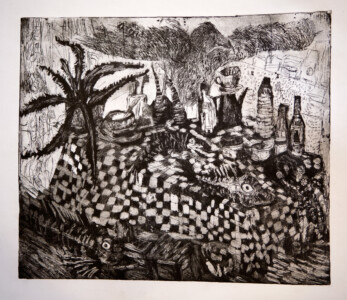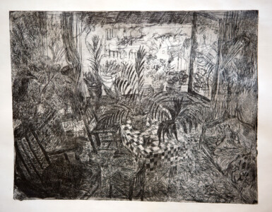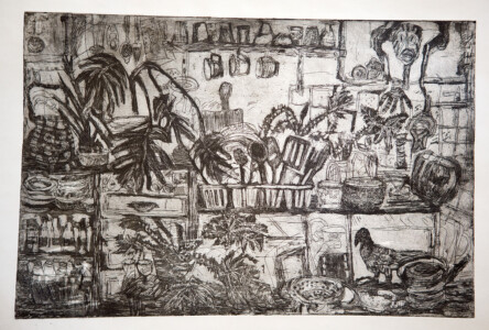 Anne Peeters grave ses lieux de vie d’une écriture volontaire. Elle nourrissait jadis des carnets de voyages et promenades à l’aquarelle. Puis ce furent des pointes-sèches sur cello, (support léger), exécutées après avoir gravi une montagne à vélo ou biné dans son potager. Rapides saisies de sensations : en plein air les poussées de végétations frénétiques ou d’architectures erratiques; dans la cuisine, la chambre, l’atelier, au bistrot celles amoncellements d’objets singuliers. Le lino sert encore une propagande efficace : affiches de spectacles du Théâtre du N-Ombr’Ile, programmes de Coiffure Liliane – une table d’hôte avec attractions qui devint un cabaret, où elle a beaucoup donné. Anne Peeters est d’une grande vitalité, elle a le cœur sur la main, elle partage dans l’enthousiasme.