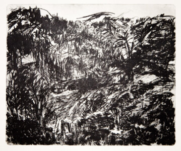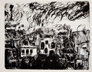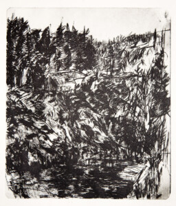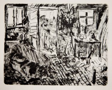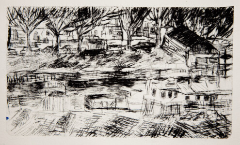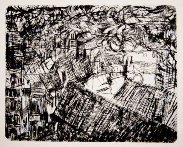 Anne Peeters grave ses lieux de vie d’une écriture volontaire. Elle nourrissait jadis des carnets de voyages et promenades à l’aquarelle. Puis ce furent des pointes-sèches sur cello, (support léger), exécutées après avoir gravi une montagne à vélo ou biné dans son potager. Rapides saisies de sensations : en plein air les poussées de végétations frénétiques ou d’architectures erratiques; dans la cuisine, la chambre, l’atelier, au bistrot celles amoncellements d’objets singuliers. Le lino sert encore une propagande efficace : affiches de spectacles du Théâtre du N-Ombr’Ile, programmes de Coiffure Liliane – une table d’hôte avec attractions qui devint un cabaret, où elle a beaucoup donné. Anne Peeters est d’une grande vitalité, elle a le cœur sur la main, elle partage dans l’enthousiasme.