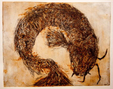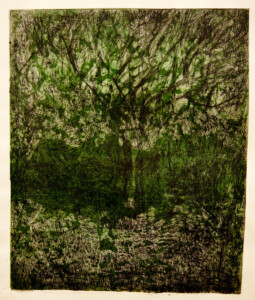 Anne Peeters dessine depuis l’enfance. Elle a peint à l’huile pendant une décennie au cours de Maria Brouillard. Elle s’est attachée à l’estampe dans l’atelier d’Anne Kellens à l’Ecole des Arts d’Ixelles, que fréquentait sa partenaire d’un théâtre d’ombres. Ce fut d’abord le noir et blanc radical du lino, puis l’expérimentation progressive du sensible par la pointe-sèche, l’eau-forte, l’aquatinte, enfin le retour à la couleur, du clair au sombre en glacis et transparences, par deux ou trois impressions surimposées : dix nouvelles années de création plastique en parallèle à une carrière de comédienne- marionnettiste à laquelle des études accomplies de philologie slave ne la destinaient guère.