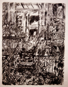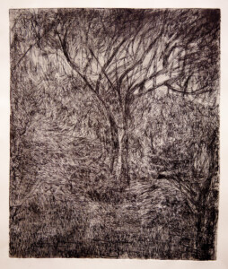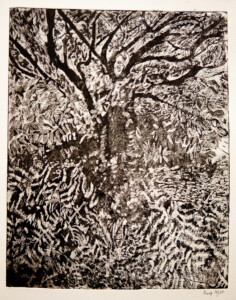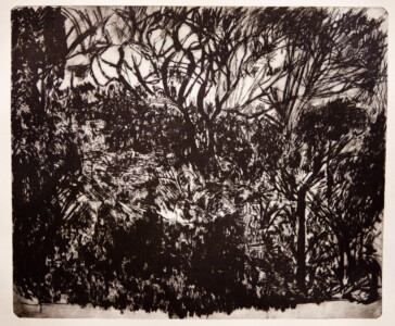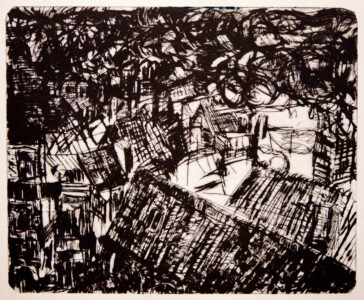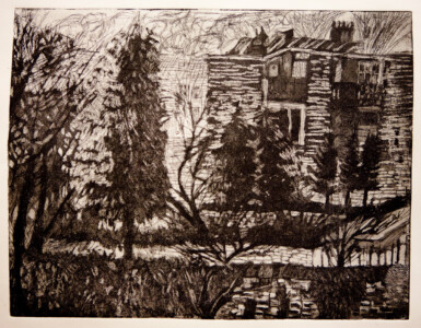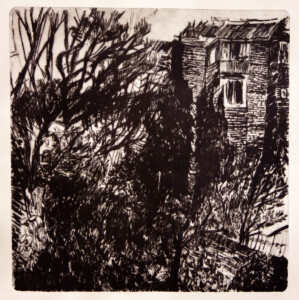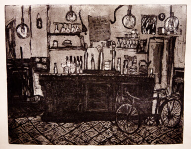 Anne Peeters grave ses lieux de vie d’une écriture volontaire. Elle nourrissait jadis des carnets de voyages et promenades à l’aquarelle. Puis ce furent des pointes-sèches sur cello, (support léger), exécutées après avoir gravi une montagne à vélo ou biné dans son potager. Rapides saisies de sensations : en plein air les poussées de végétations frénétiques ou d’architectures erratiques; dans la cuisine, la chambre, l’atelier, au bistrot celles amoncellements d’objets singuliers. Le lino sert encore une propagande efficace : affiches de spectacles du Théâtre du N-Ombr’Ile, programmes de Coiffure Liliane – une table d’hôte avec attractions qui devint un cabaret, où elle a beaucoup donné. Anne Peeters est d’une grande vitalité, elle a le cœur sur la main, elle partage dans l’enthousiasme.