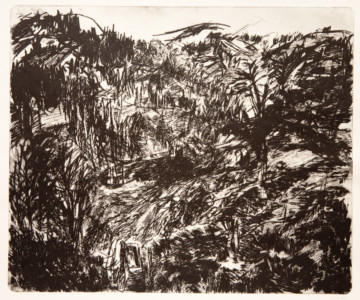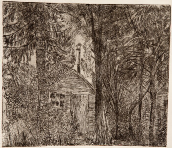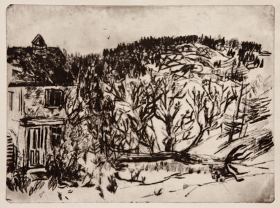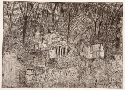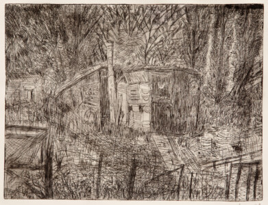 Anne Peeters grave ses lieux de vie d’une écriture volontaire. Elle nourrissait jadis des carnets de voyages et promenades à l’aquarelle. Puis ce furent des pointes-sèches sur cello, (support léger), exécutées après avoir gravi une montagne à vélo ou biné dans son potager. Rapides saisies de sensations : en plein air les poussées de végétations frénétiques ou d’architectures erratiques; dans la cuisine, la chambre, l’atelier, au bistrot celles amoncellements d’objets singuliers. Le lino sert encore une propagande efficace : affiches de spectacles du Théâtre du N-Ombr’Ile, programmes de Coiffure Liliane – une table d’hôte avec attractions qui devint un cabaret, où elle a beaucoup donné. Anne Peeters est d’une grande vitalité, elle a le cœur sur la main, elle partage dans l’enthousiasme.