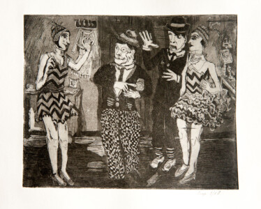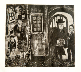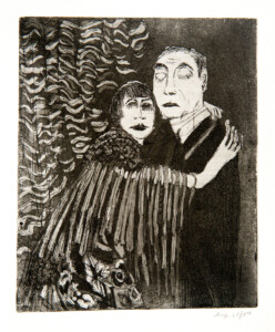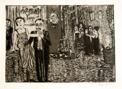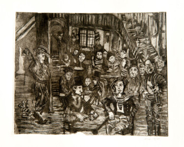 Anne Peeters grave ses lieux de vie d’une écriture volontaire. Elle nourrissait jadis des carnets de voyages et promenades à l’aquarelle. Puis ce furent des pointes-sèches sur cello, (support léger), exécutées après avoir gravi une montagne à vélo ou biné dans son potager. Rapides saisies de sensations : en plein air les poussées de végétations frénétiques ou d’architectures erratiques; dans la cuisine, la chambre, l’atelier, au bistrot celles amoncellements d’objets singuliers. Le lino sert encore une propagande efficace : affiches de spectacles du Théâtre du N-Ombr’Ile, programmes de Coiffure Liliane – une table d’hôte avec attractions qui devint un cabaret, où elle a beaucoup donné. Anne Peeters est d’une grande vitalité, elle a le cœur sur la main, elle partage dans l’enthousiasme.