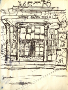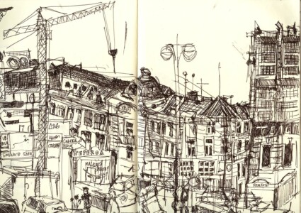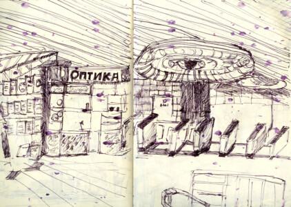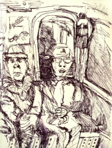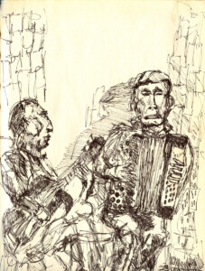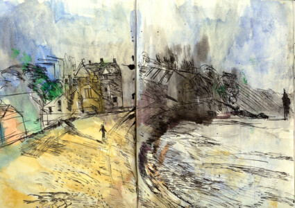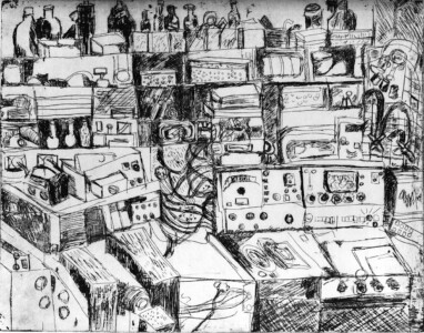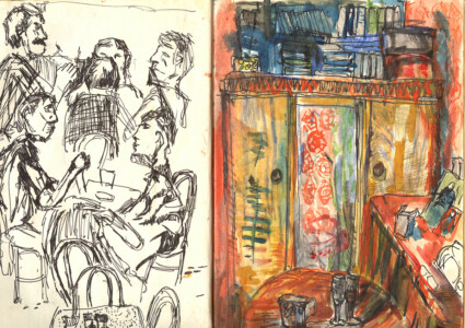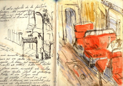 Anne Peeters grave ses lieux de vie d’une écriture volontaire. Elle nourrissait jadis des carnets de voyages et promenades à l’aquarelle. Puis ce furent des pointes-sèches sur cello, (support léger), exécutées après avoir gravi une montagne à vélo ou biné dans son potager. Rapides saisies de sensations : en plein air les poussées de végétations frénétiques ou d’architectures erratiques; dans la cuisine, la chambre, l’atelier, au bistrot celles amoncellements d’objets singuliers. Le lino sert encore une propagande efficace : affiches de spectacles du Théâtre du N-Ombr’Ile, programmes de Coiffure Liliane – une table d’hôte avec attractions qui devint un cabaret, où elle a beaucoup donné. Anne Peeters est d’une grande vitalité, elle a le cœur sur la main, elle partage dans l’enthousiasme.