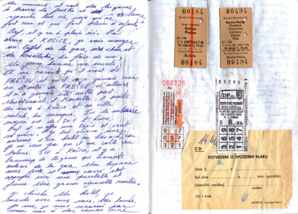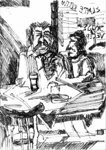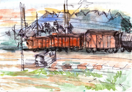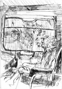 Anne Peeters grave ses lieux de vie d’une écriture volontaire. Elle nourrissait jadis des carnets de voyages et promenades à l’aquarelle. Puis ce furent des pointes-sèches sur cello, (support léger), exécutées après avoir gravi une montagne à vélo ou biné dans son potager. Rapides saisies de sensations : en plein air les poussées de végétations frénétiques ou d’architectures erratiques; dans la cuisine, la chambre, l’atelier, au bistrot celles amoncellements d’objets singuliers. Le lino sert encore une propagande efficace : affiches de spectacles du Théâtre du N-Ombr’Ile, programmes de Coiffure Liliane – une table d’hôte avec attractions qui devint un cabaret, où elle a beaucoup donné. Anne Peeters est d’une grande vitalité, elle a le cœur sur la main, elle partage dans l’enthousiasme.